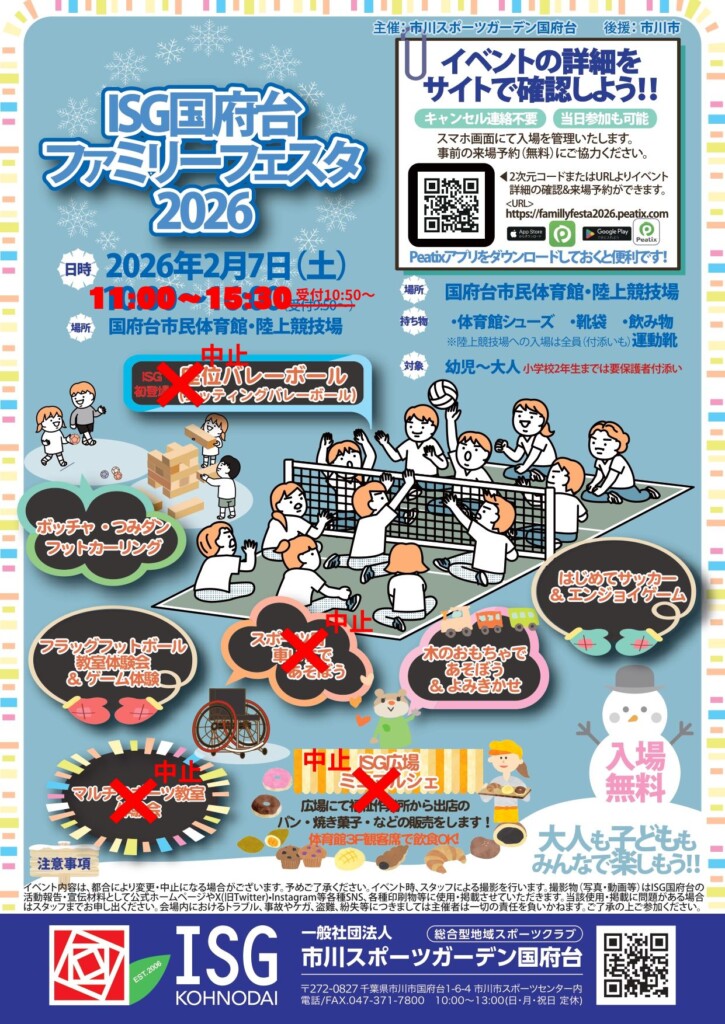 ISG冬のイベント、ファミリーフェスタ2026が2/7㈯に開催されます。 寒い冬に負けずに、みんなでスポーツをしよう!!